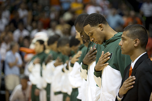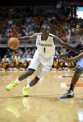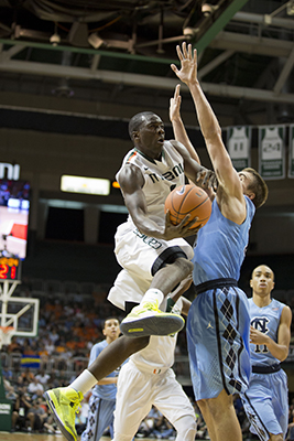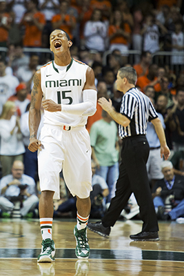 Saturday was the kind of thrilling performance that brought another capacity crowd to its feet, which included Miami Heat superstars LeBron James, Dwyane Wade and former Hurricane James Jones. After Larkin’s alley-oop off the backboard to a trailing senior forward/center Kenny Kadji, even James and Wade leapt out of their courtside seats.