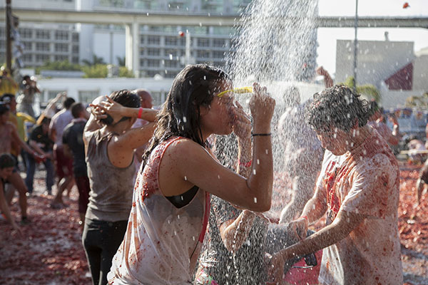 Hundreds of people gathered at Miami’s oldest bar for two very crucial things: an open bar of draft brew and permission to chuck 20,000 pounds worth of left-over tomatoes at just about anybody around them.