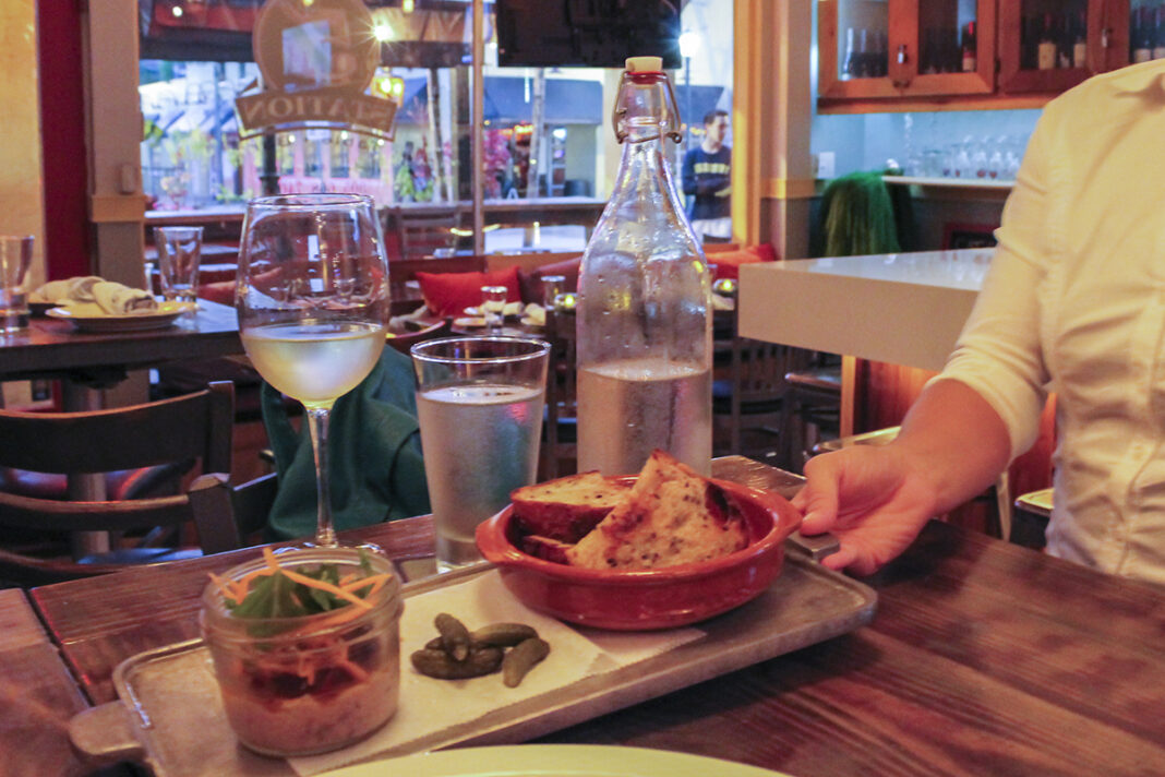 A mixture of light and dark woods with pressed, tin ceilings, the style evokes an upscale version of an old family restaurant. This family vibe is enhanced by charming knick-knacks and family photos adorning the shelves. The biggest triumph of the decor, though, is the blown glass bulbs filled with tea lights that adorn the walls to provide a soft glow. It’s romantic, intimate and perfect for a date night.