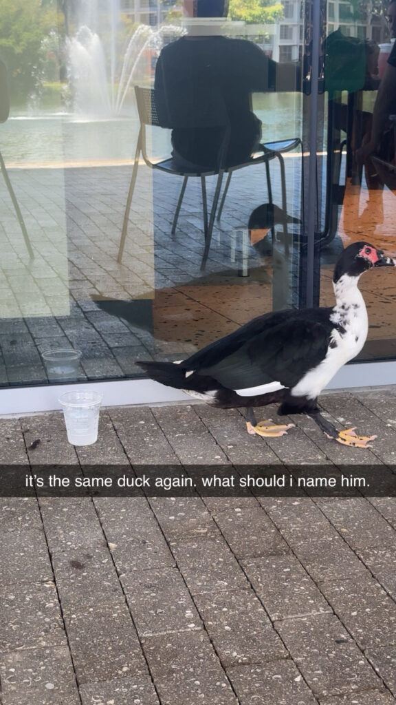 According to multiple sources, the duck in the photo and the video is the same beloved duck that the community has named “Ivan.” Ivan is notoriously friendly, frequently waddling up to students in hopes of food or water.