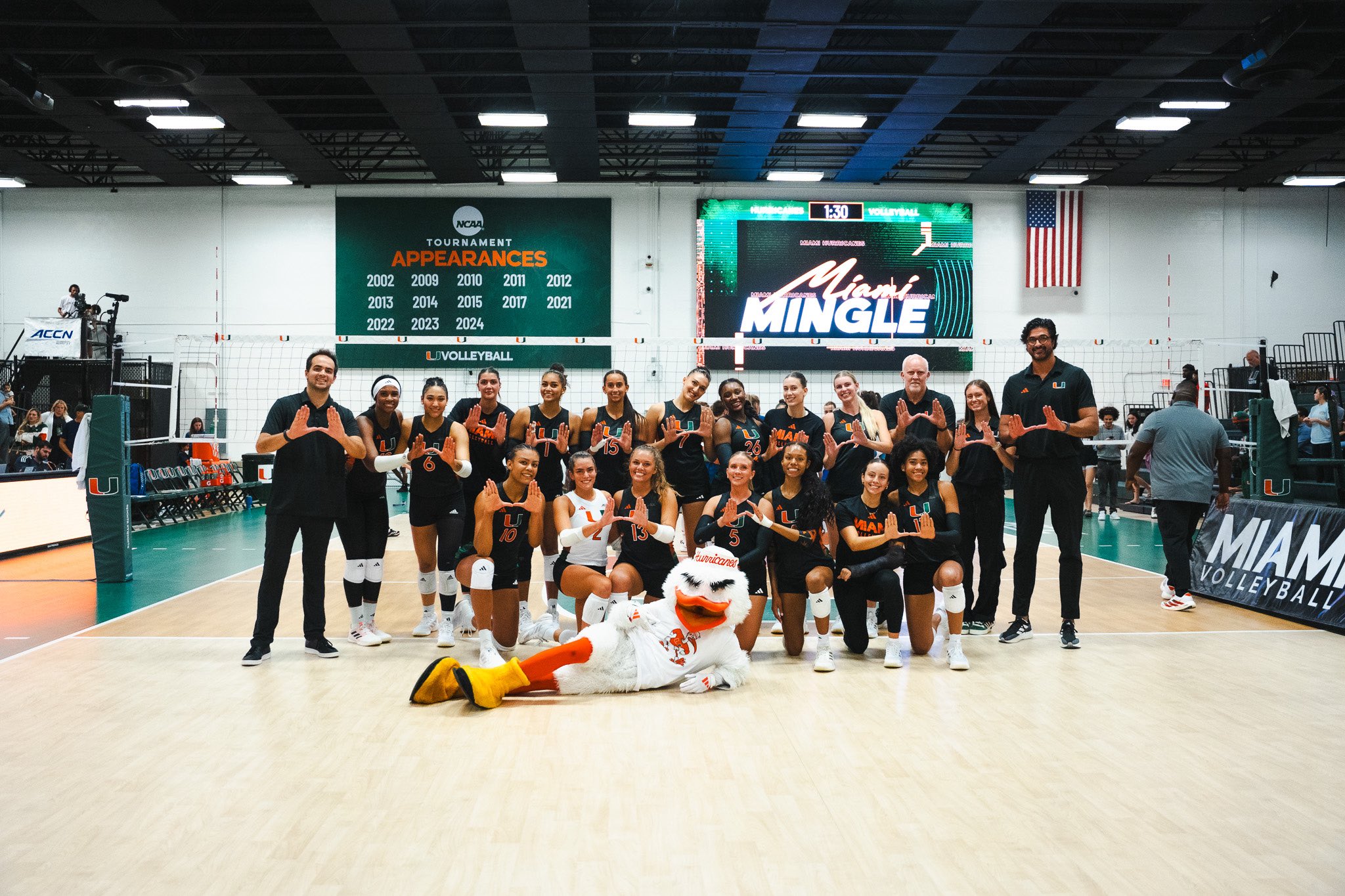 Miami had the tone set early, with eight team blocks to edge out a tight first set, 26-24. The Hurricanes carried that momentum into set two, hitting .571 as Heredia Colon recorded six of her 15 kills to fuel a dominant 25-14 win. Ava Carney and Amina N’Diaye contributed key kills during an opening run, while on defense, Naylani Feliciano helped steady the back row with several critical digs.