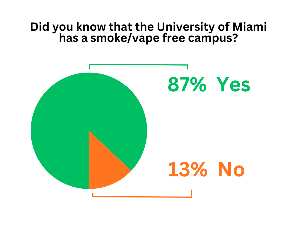 The University of Miami Coral Gables campus became a smoke free campus on August 1, 2013, making smoking prohibited on all campus property. Even with this policy in place, a cloudy haze can still be spotted all around campus as students use their e-cigarette devices.