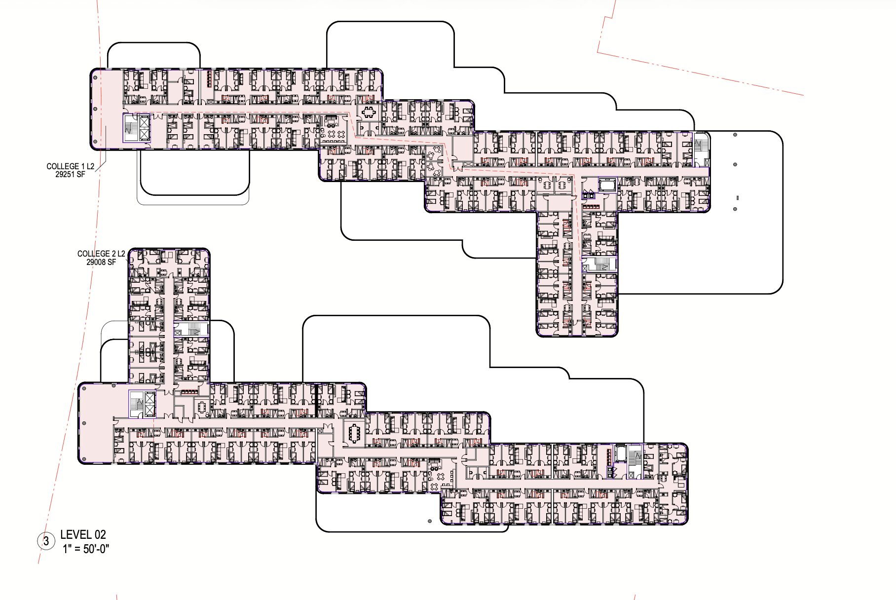 The building referred to as “residential college one” will have 222 units and 735 beds spread across nine floors. “Residential college two” will have 207 units and 723 beds across 10 floors. The total of 1,458 beds is 32 more beds than Mahoney-Pearson’s current 1,426 beds.