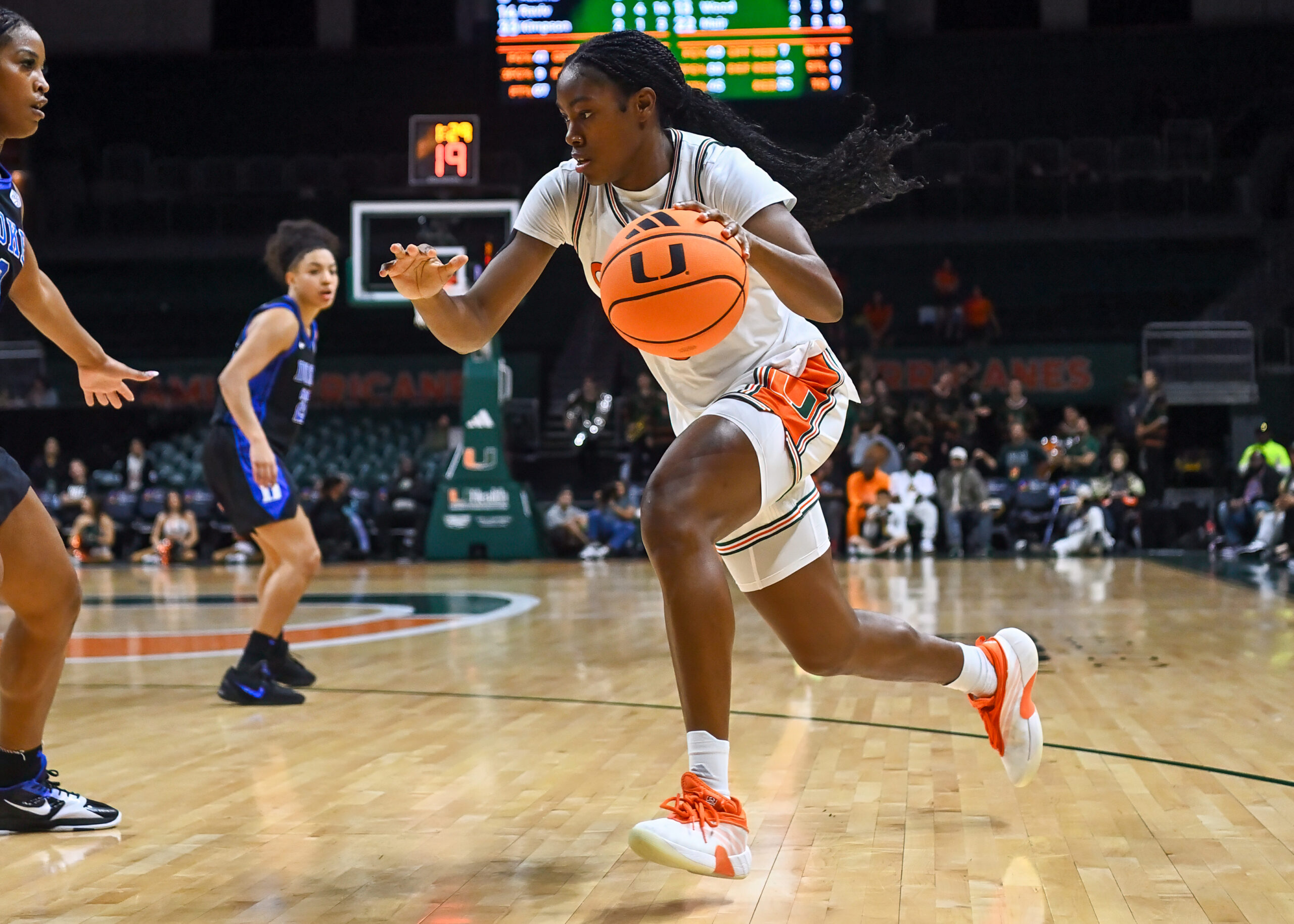 After intense action up and down the court, the Hurricanes trailed behind the Blue Devils 39-23 going into halftime.