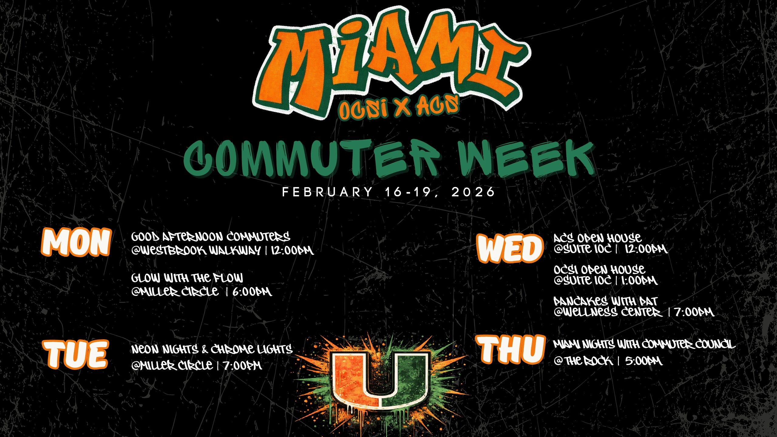 To close off this exciting week is “Miami Nights” with the Commuter Council. A Miami vice-themed celebration taking place at the Rock Plaza that will feature an array of food, some activities, music and exciting giveaways.