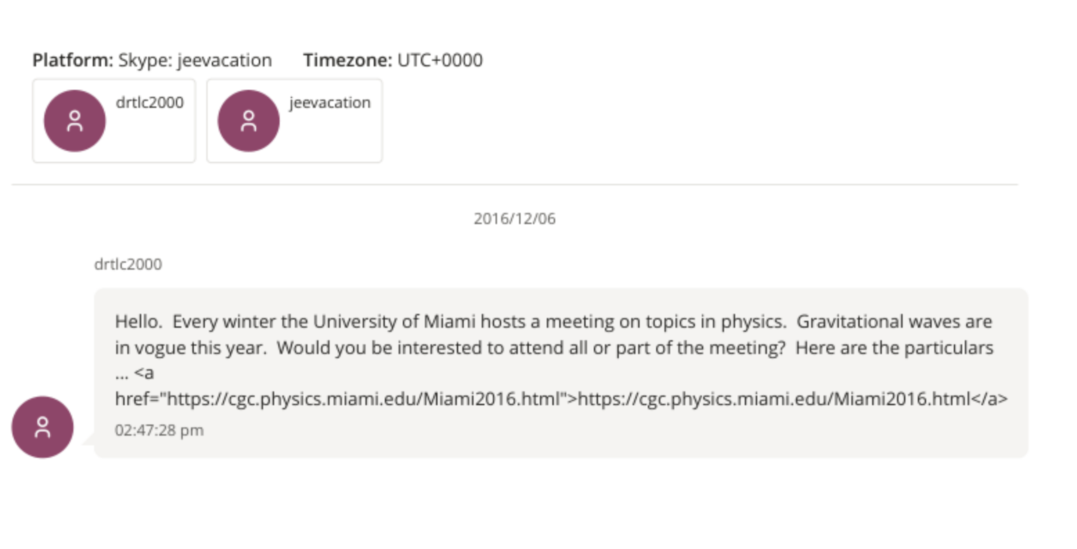In a text via Skype to Epstein on Dec. 6, 2016, Curtright said, “Hello. Every winter the University of Miami hosts a meeting on topics in physics. Gravitational waves are in vogue this year. Would you be interested to attend all or part of the meeting? Here are the particulars …”
