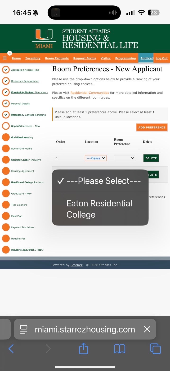 Once spring admits reached the room preferences portion of the housing application, they were only given the option to select a room configuration preference within Eaton Residential College. Lakeside did not appear in the drop down.