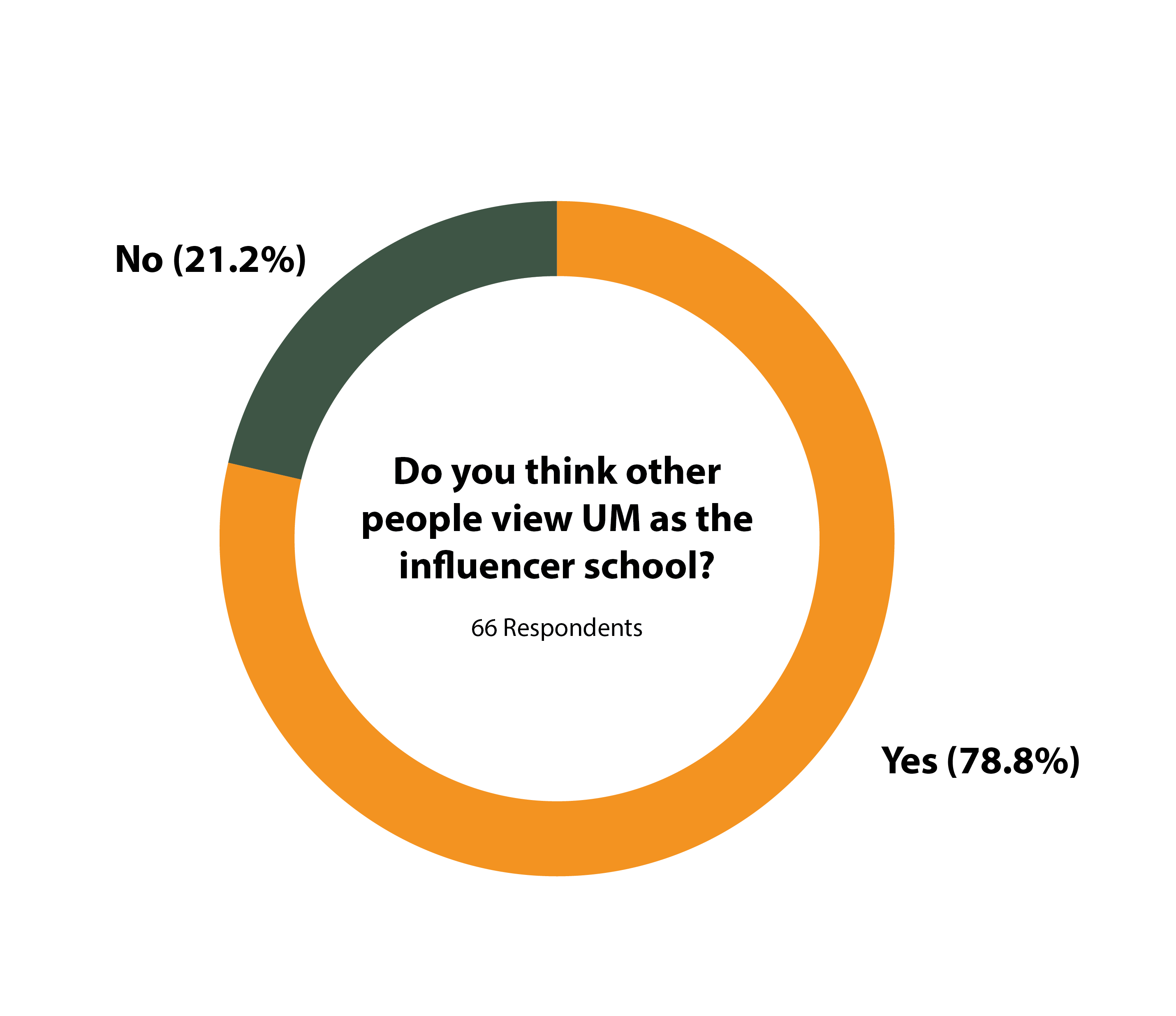The survey, posted for 48 hours on The Hurricane’s Instagram story, showed that 78.8% of 66 student responders think the public views UM as “Influencer U.”