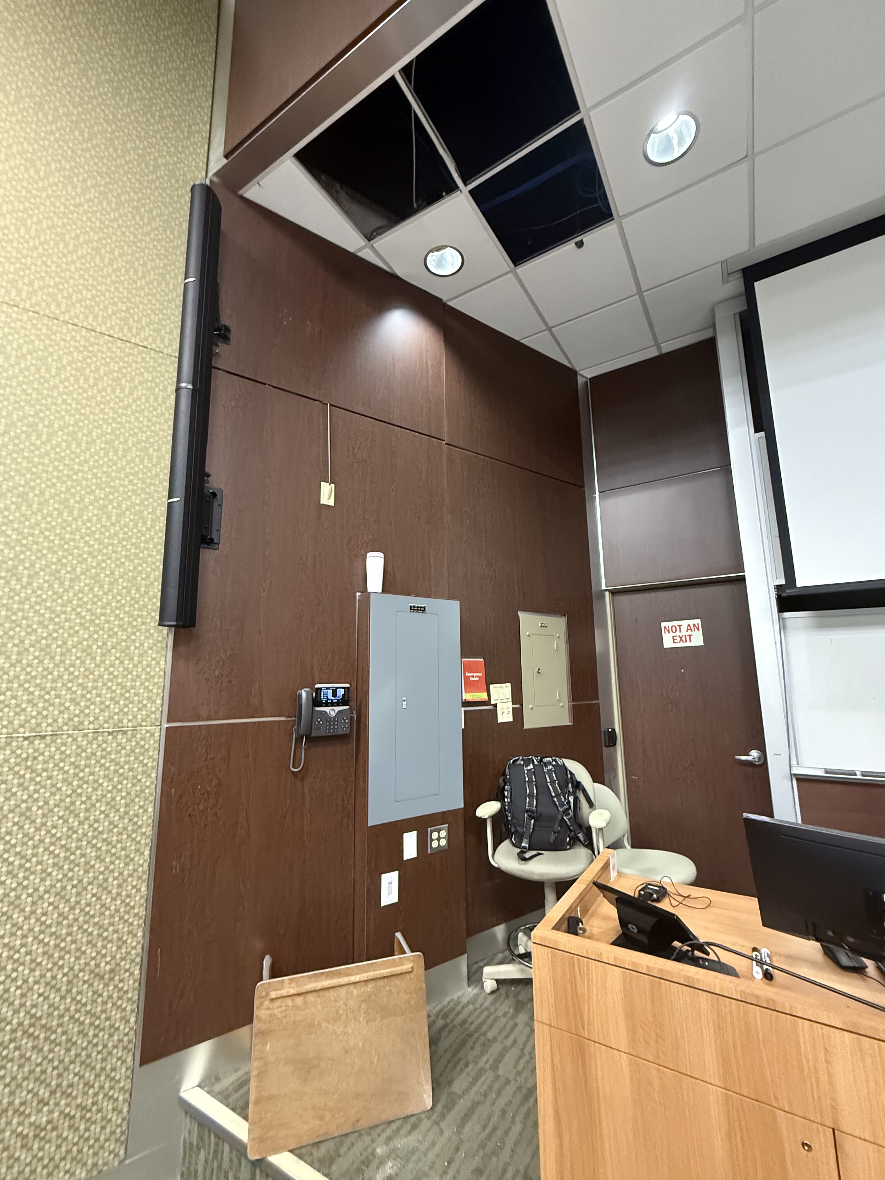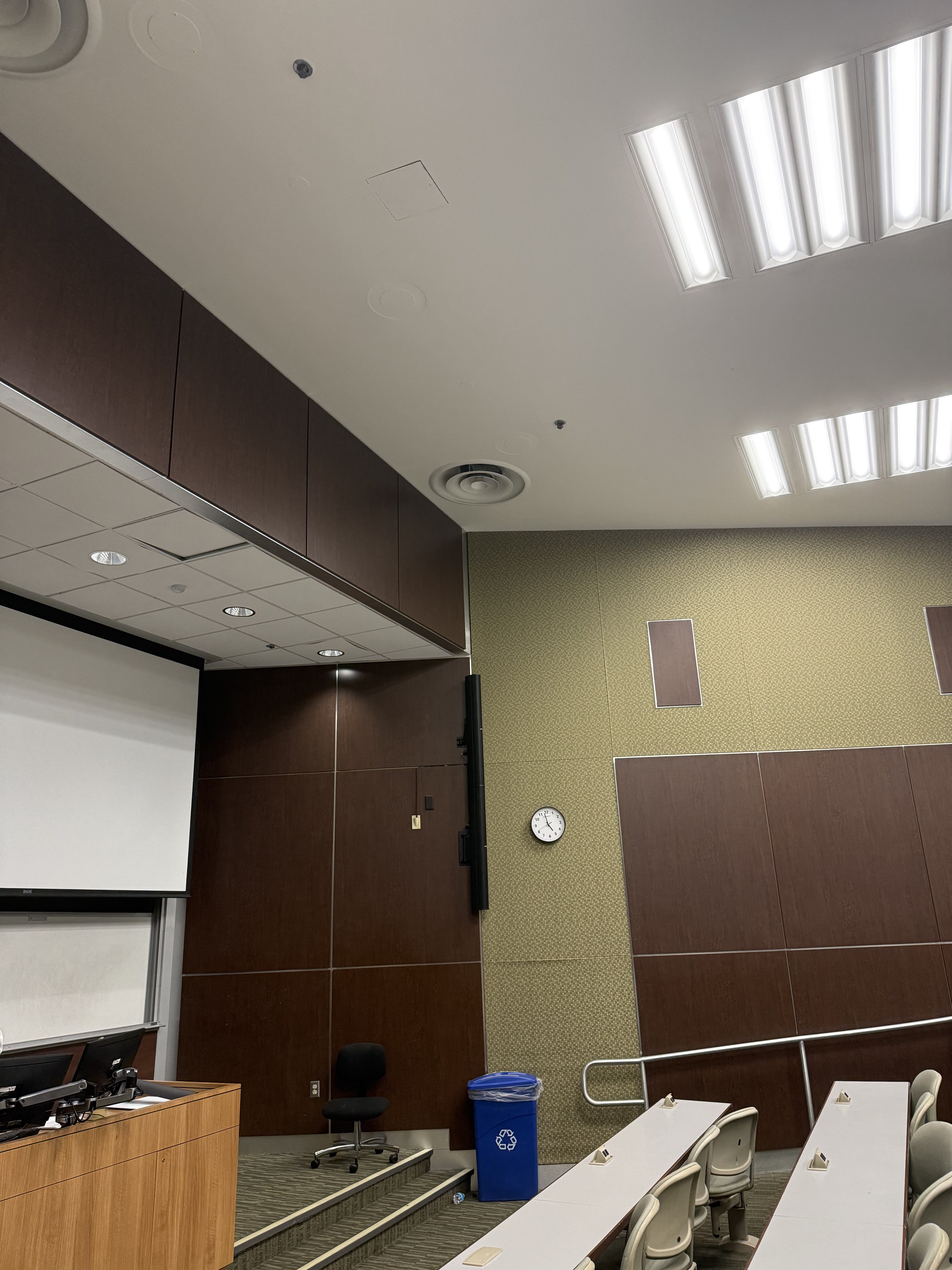 The ceiling in Whitten 170 is designed so that the back of the classroom has paneling, the middle is solid, and the front of the classroom near the professor has a paneled ceiling that is lower than the rest of the classroom. The student suspects that the opossums ran from the back of the classroom to the front and fell onto the panels that are lower, causing them to fall through.