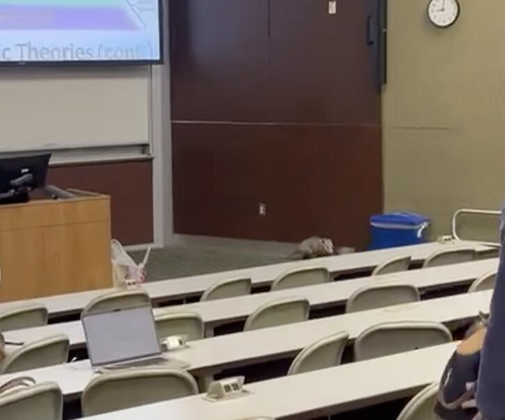 The opossums fell through the ceiling near the front of the classroom and landed next to the professor, Dr. Melissa Noya, while she was teaching her 8 a.m. PSY110 course.