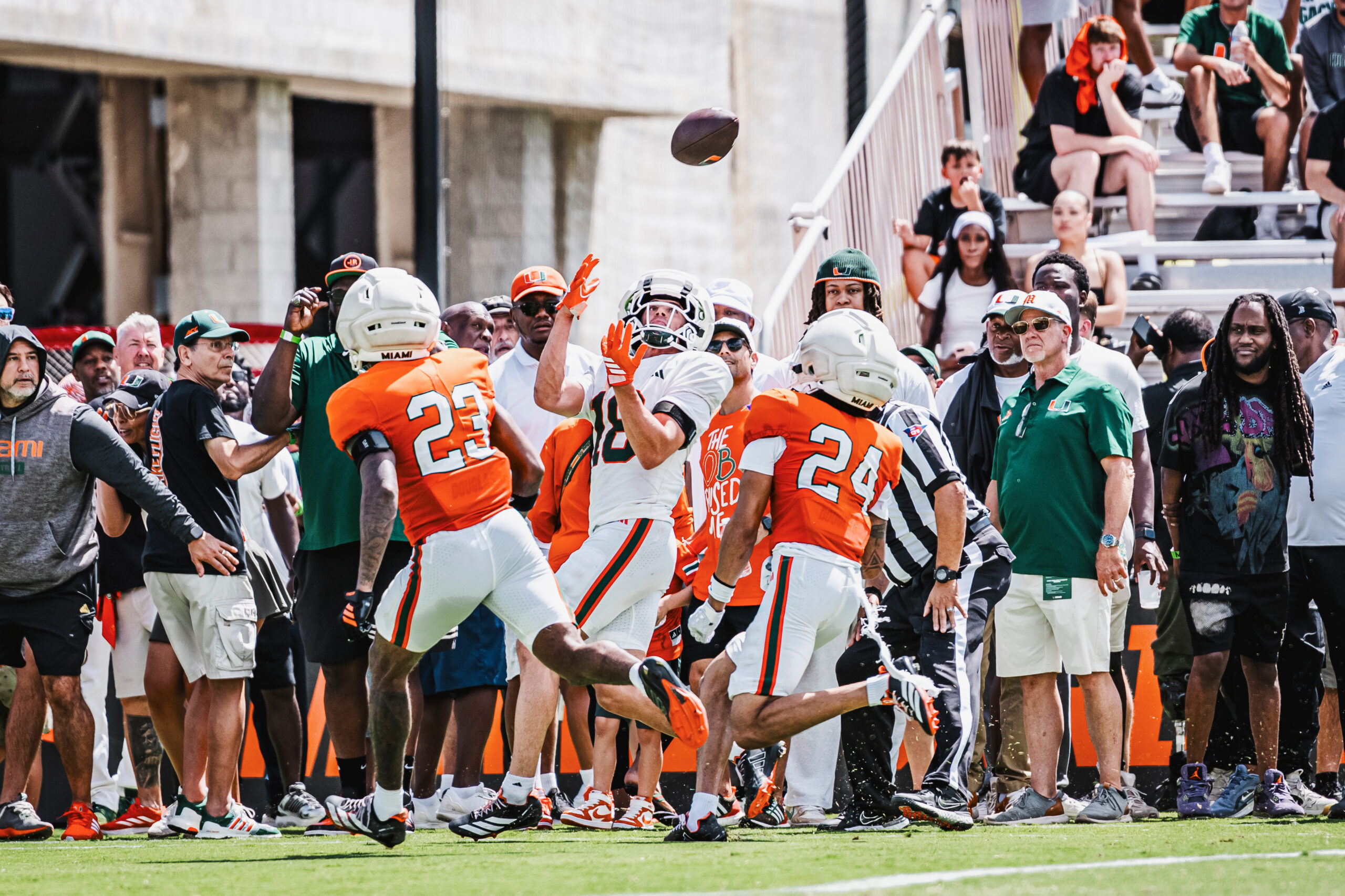 The annual spring game offered exactly that: a mix of evaluation and entertainment. Miami structured the day differently this year, using the first half for position drills, including passing, red zone and agility work, before transitioning into a live scrimmage in the second half.
